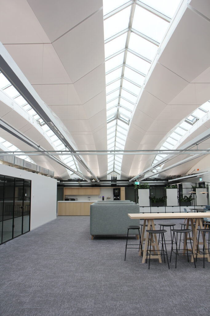 Besondere Highlights sind die Heiz- und Kühldecken in der Gelenkbogenhalle des Gebäudes 6 sowie die beschreibbaren, magnetischen und gekühlten Arbeitswände der Raum-in-Raum-Zimmer.