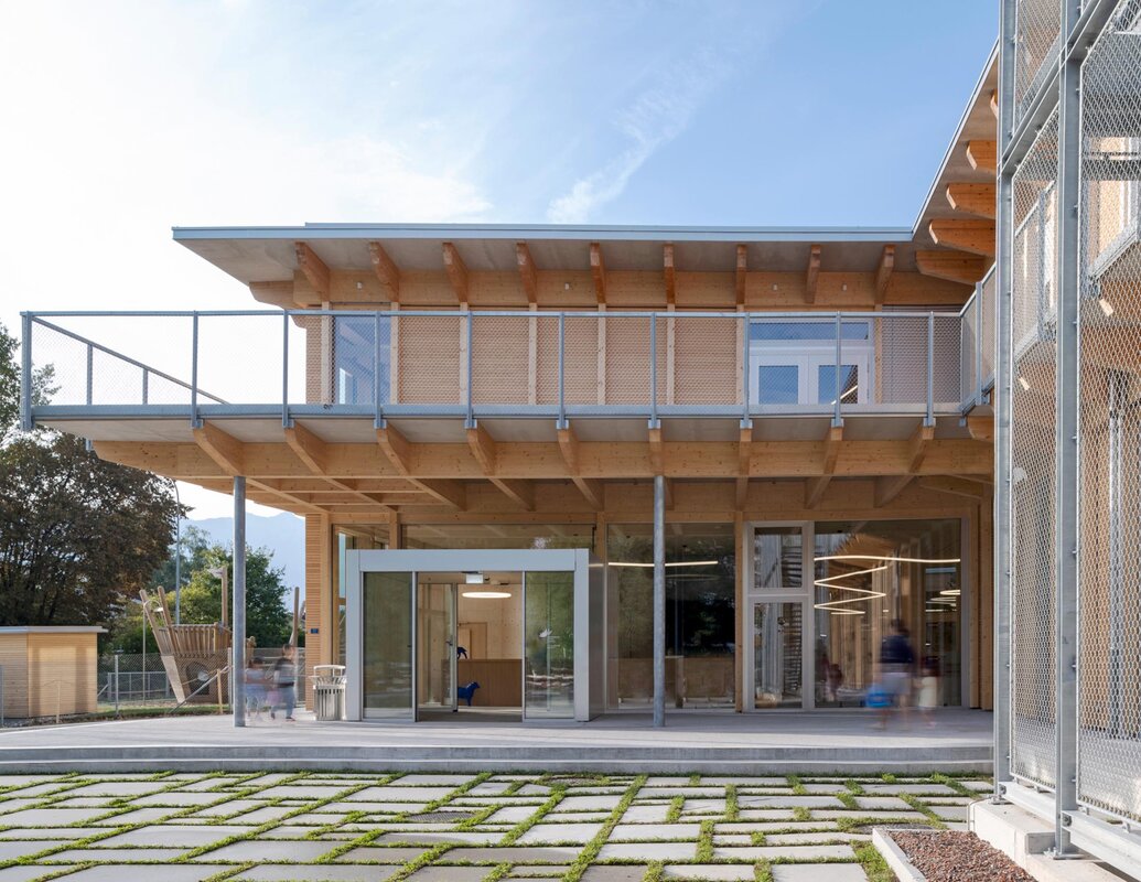 quaten Platz mit seinen eigenen Raumqualitäten und ermöglicht den Schülern eine Identifikation mit ihrer Schule. Aufgrund des umweltfreundlichen Holzbaus, der integrierten PV Anlagen, der intensiven Dachbegrünung, der Aussenraumgestaltung, sowie der Verbundlüftung wird die Schule beispielhaft zur Einhaltung der Klimaziele 2050 beitragen.