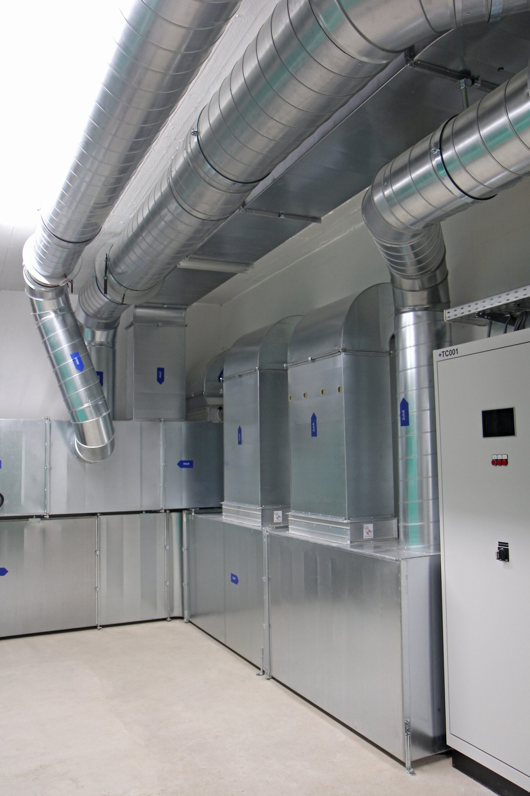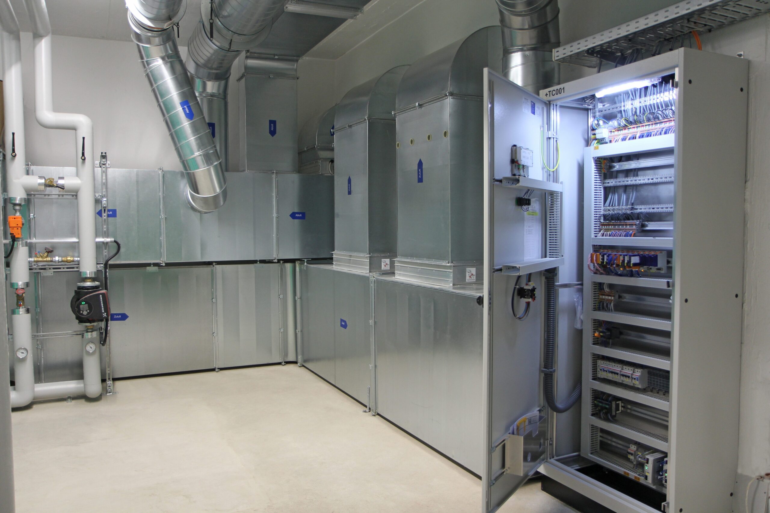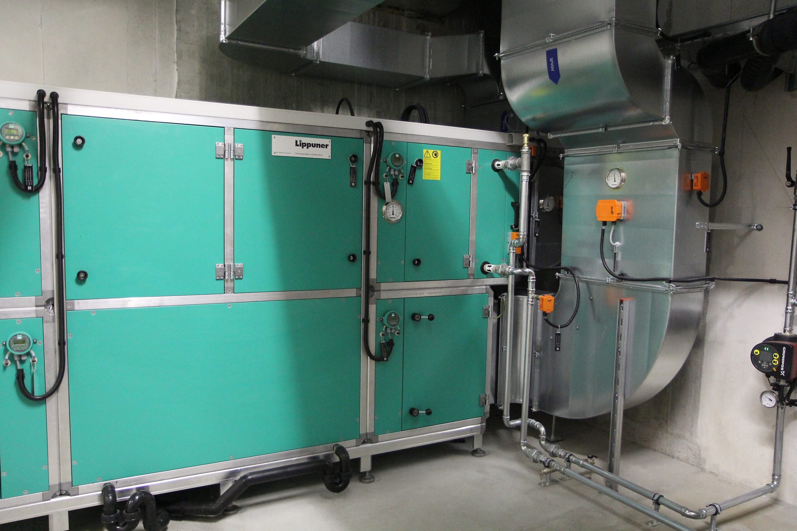 Lippuner sanierte die zwei Lüftungsanlagen der Turnhalle, inkl. Kompletter Kanalverteilung in der Hallendecke, sowie die Lüftungsanlage Garderoben im Untergeschoss. Ebenfalls wurde die gesamte Gebäudeautomation der beiden Anlagen ersetzt.